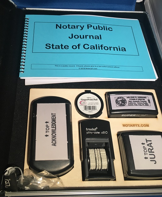 Wood holder for notary tools. Everything fits in its own space. Helps prevent you from leaving equipment behind.
